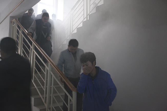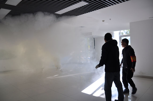 下午兩點(diǎn)三十分,博電園區(qū)A座一層點(diǎn)燃煙餅?zāi)M火情,濃煙迅速蔓延,煙感器自動(dòng)感知迅速全樓報(bào)警,消控室在接到現(xiàn)場(chǎng)報(bào)警后第一時(shí)間報(bào)告總指揮,總指揮迅速啟動(dòng)消防疏散應(yīng)急預(yù)案。