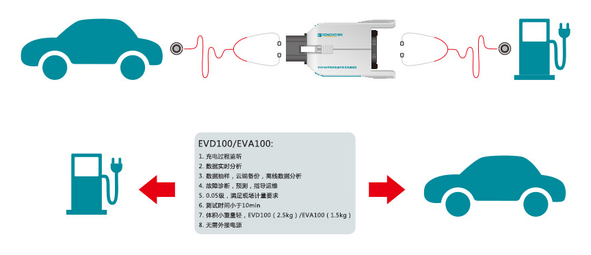 EVD100手持式直流監(jiān)測儀通過對充電過程中模擬信號和數(shù)據(jù)信號的全程監(jiān)測、記錄,實現(xiàn)電動汽車充電的現(xiàn)場診斷,故障分析;以插接的方式連接外部負載,可實現(xiàn)電動汽車充電機互操作性、通訊一致性和電氣性測試。