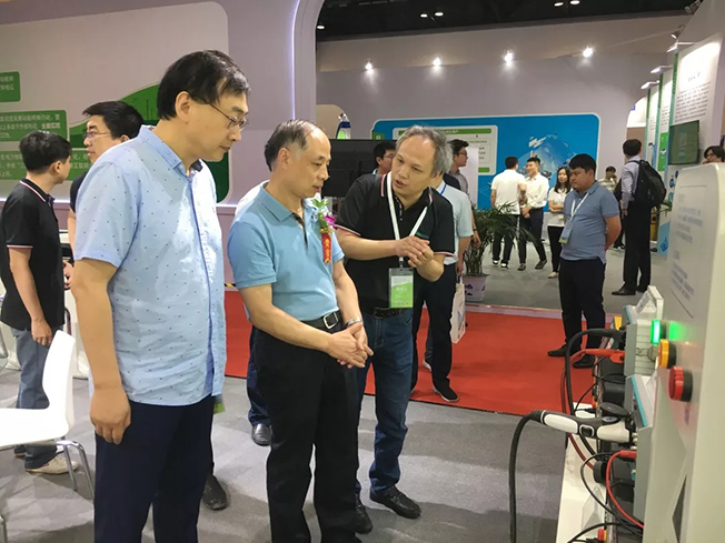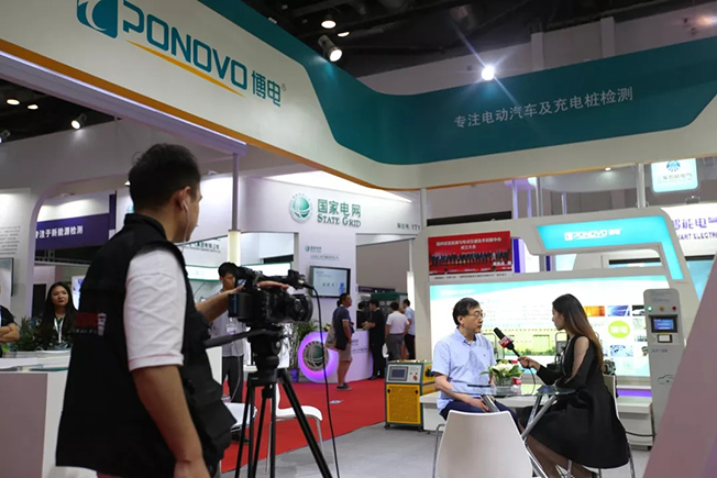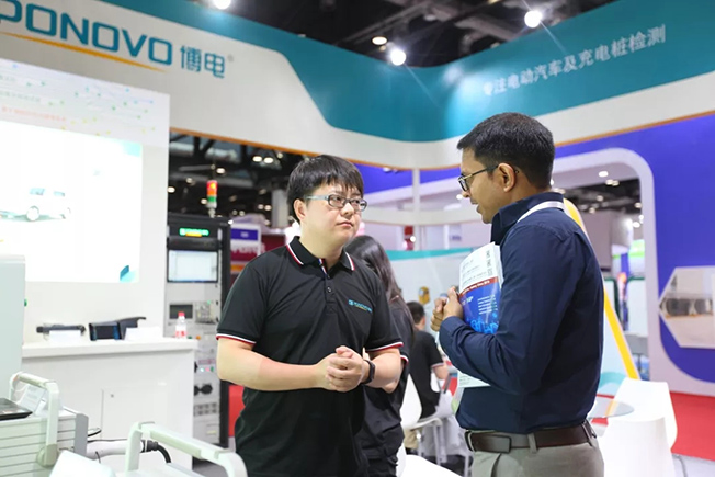 賈總和陳總參觀擺放在國網(wǎng)電動汽車服務有限公司展臺的配套測試設備——博電充電樁巡檢儀。