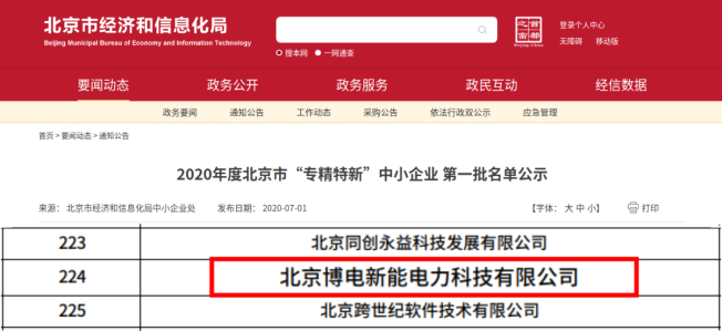 7月1日,北京博電新力電氣股份有限公司全資子公司——北京博電新能電力科技有限公司(簡(jiǎn)稱“博電新能”)成功入選由北京市經(jīng)濟(jì)和信息化局中小企業(yè)處遴選的2020年度北京市“專精特新”中小企業(yè)(第一批)。當(dāng)前,第一批入圍名單正在北京市經(jīng)濟(jì)和信息化局官方網(wǎng)站上公示。