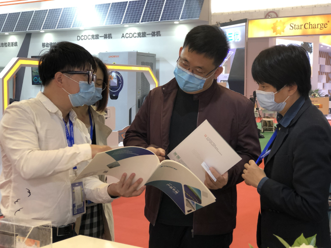 ▲國(guó)網(wǎng)電動(dòng)汽車(chē)服務(wù)有限公司闕詩(shī)豐副總經(jīng)理蒞臨博電展位詳細(xì)了解積木式電動(dòng)汽車(chē)交/直流充電設(shè)施現(xiàn)場(chǎng)檢測(cè)設(shè)備