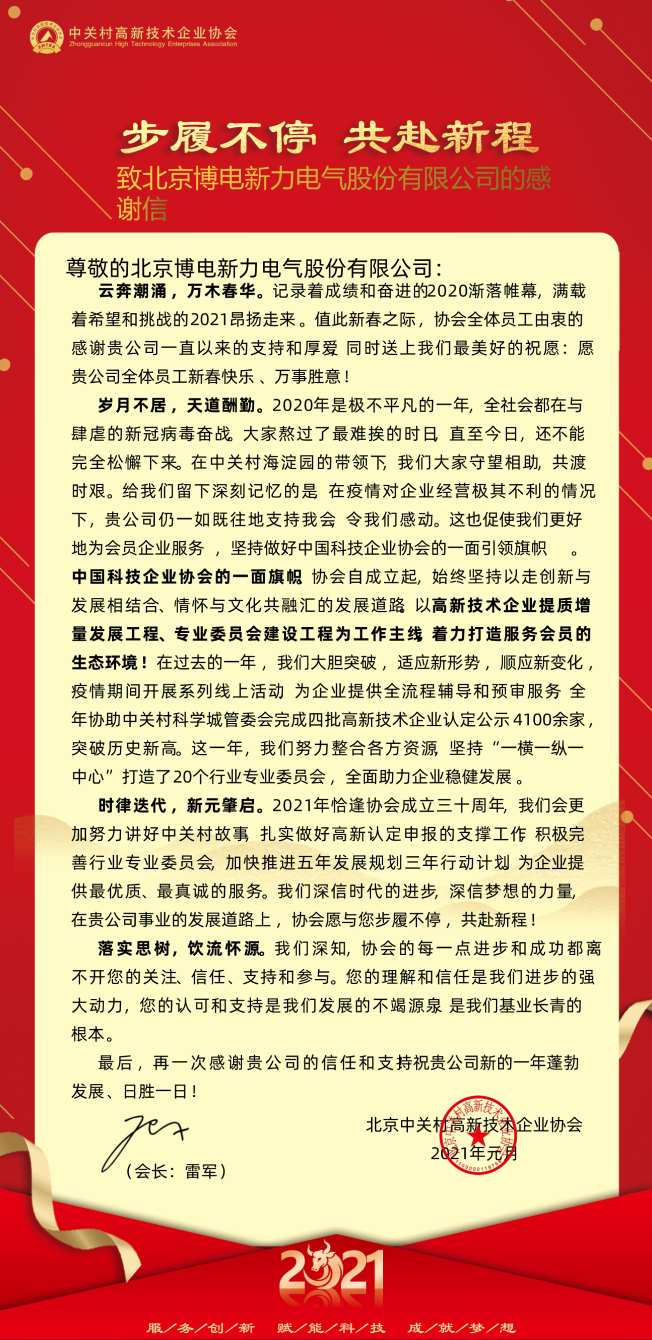 新年到來,博電科技再迎新喜。1月,博電科技收到一封來自北京中關(guān)村高新技術(shù)企業(yè)協(xié)會的感謝信。信中指出“2020年是極不平凡的一年。給我們留下深刻記憶的是,在疫情對企業(yè)經(jīng)營極其不利的情況下,貴公司仍一如既往地支持我會,令我們感動?!?/span>