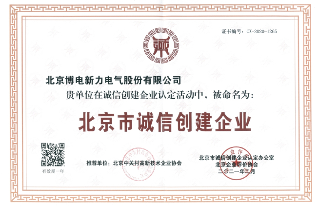 博電科技由北京北京中關(guān)村高新技術(shù)企業(yè)協(xié)會(huì)推薦,通過層層篩選,最終不負(fù)眾望,摘得“北京市誠(chéng)信創(chuàng)建企業(yè)”稱號(hào)。