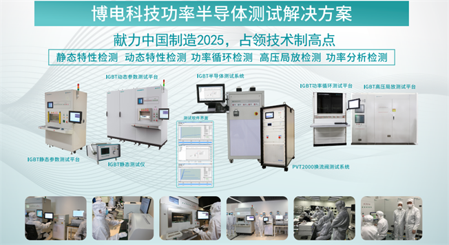 在功率半導(dǎo)體測試領(lǐng)域,博電科技推出以高速高頻、高壓、大電流功率源為基礎(chǔ)、并結(jié)合高速高精度的高壓、大電流模擬采集技術(shù)及高速數(shù)字處理控制系統(tǒng)的智能測試平臺。該平臺根據(jù)不同需求可完成各類功率半導(dǎo)體器件、模塊、芯片的動態(tài)參數(shù)、靜態(tài)參數(shù),熱力參數(shù)及力學(xué)參數(shù),功率壽命參數(shù)測試;是國內(nèi)相關(guān)研制生產(chǎn)單位的研發(fā)測試、工程驗(yàn)收、出廠測試等領(lǐng)域進(jìn)行自動測試的檢測平臺。