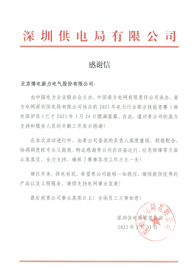 近日,博電科技收到來自深圳供電局有限公司的感謝信,對方給予博電科技技術(shù)實力和綜合服務(wù)充分肯定和高度評價!