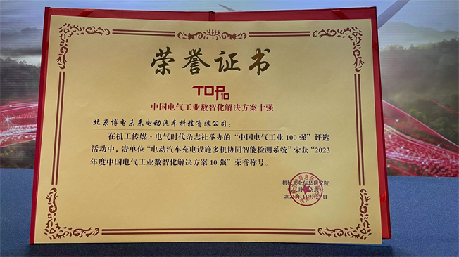 2023年11月23日,第19屆中國電氣工業(yè)發(fā)展高峰論壇暨“第23屆中國電氣工業(yè)100強(qiáng)研究”發(fā)布會在北京成功舉辦。博電科技全資子公司——北京博電未來電動汽車科技有限公司(以下簡稱“未來電動”)承擔(dān)的“電動汽車充電設(shè)施多機(jī)協(xié)同智能檢測系統(tǒng)”項(xiàng)目實(shí)力斬獲“2023年度中國電氣工業(yè)數(shù)智化解決方案 10 強(qiáng)”榮譽(yù)稱號。