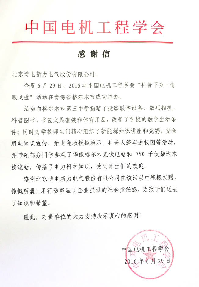 本次活動(dòng)是繼去年博電參加 “2015電力科普畢節(jié)行”活動(dòng)之后,又一次為邊區(qū)兒童送去溫暖,為邊遠(yuǎn)地區(qū)孩子們更好地學(xué)習(xí)和成長(zhǎng)提供力所能及的幫助。北京博電公司參與科普下鄉(xiāng)活動(dòng),關(guān)愛(ài)邊區(qū)孩子的行為贏得了業(yè)內(nèi)高度贊賞?;顒?dòng)結(jié)束后,中國(guó)電機(jī)工程學(xué)會(huì)給博電公司發(fā)來(lái)感謝信,稱贊其高度的社會(huì)責(zé)任感,勇于擔(dān)當(dāng),甘于奉獻(xiàn)的社會(huì)精神,并對(duì)參與本次活動(dòng)表示感謝。
