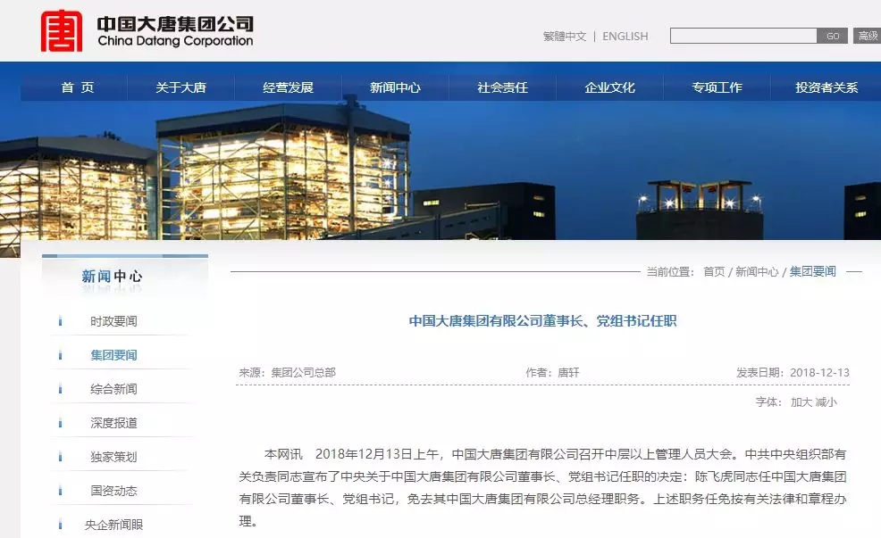 12月13日上午,國(guó)家電網(wǎng)公司和中國(guó)大唐集團(tuán)分別召開會(huì)議,宣布:寇偉同志任國(guó)家電網(wǎng)有限公司董事長(zhǎng)、黨組書記;陳飛虎同志任中國(guó)大唐集團(tuán)有限公司董事長(zhǎng)、黨組書記。