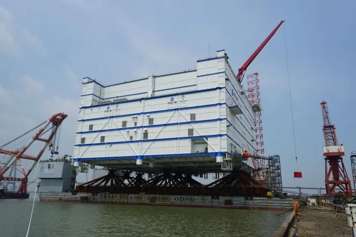 三峽如東海上換流站平面面積近乎一個標(biāo)準(zhǔn)足球場,高度約等于15層居民樓,重量接近10個響水海上升壓站,是名副其實的“大塊頭”。據(jù)了解,目前世界最大吊裝能力的起重船為12000噸,無法滿足該換流站約22000噸的吊裝重量要求。三峽集團(tuán)將打破常規(guī)安裝方法,利用船舶壓載和自然潮汐作用,在國內(nèi)創(chuàng)新使用浮拖法進(jìn)行海上換流站安裝。