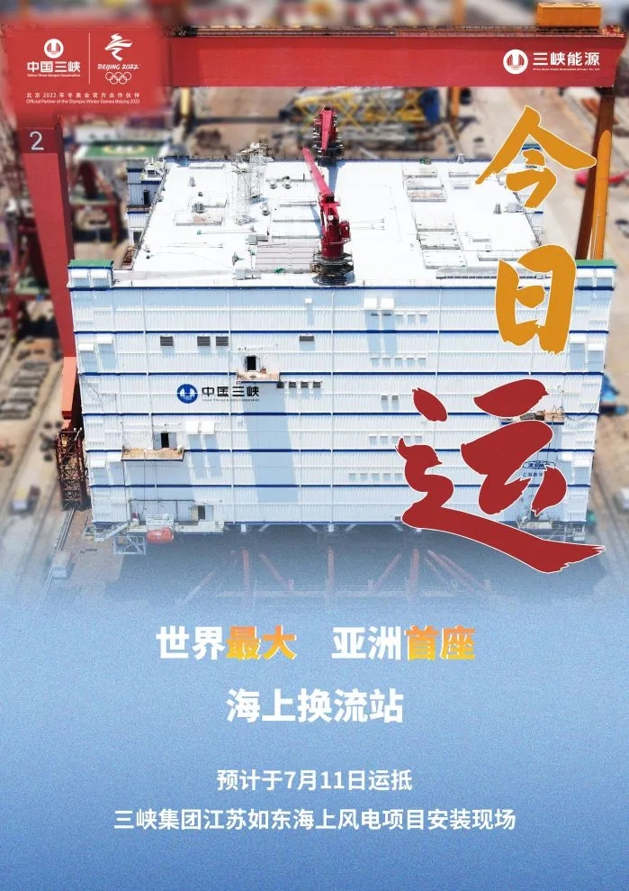 7月8日11時15分,一幢相當(dāng)于15層樓高的“鋼鐵巨屋”,由江向海,鳴笛啟航!這里是世界最大、亞洲首座海上換流站發(fā)運儀式現(xiàn)場——從江蘇南通的長江岸邊出發(fā),預(yù)計3日后抵達(dá)黃海海域,并在三峽集團(tuán)江蘇如東海上風(fēng)電項目現(xiàn)場進(jìn)行安裝。這是繼2016年在江蘇響水建成投運亞洲首座220千伏海上升壓站后,中國三峽新能源(集團(tuán))股份有限公司(股票簡稱“三峽能源”,股票代碼“600905”)助力江蘇經(jīng)濟(jì)社會綠色發(fā)展、推動我國海上風(fēng)電高端裝備制造升級的又一大手筆之作?! ?
