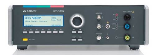 b) UCS500N5抗擾度綜合測(cè)試儀,輸出電壓范圍:電快速瞬變脈沖群200V~5.5kV,浪涌160V~5kV??梢酝瓿苫跇?biāo)準(zhǔn)GB/T 17626.4-2008的電快速瞬變脈沖群抗擾度試驗(yàn)以及GB/T17626.5-2008的浪涌(沖擊)抗擾度試驗(yàn)。